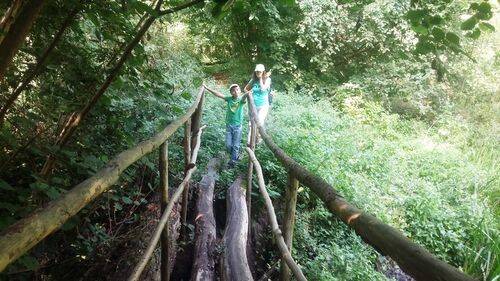 Trasa, którą teraz wędrowaliśmy okazała się chyba jedną z najbardziej urokliwych tras naszych wędrówek. Ścieżka wiodła nas wśród drzewnej gęstwiny, a u naszych stóp podziwiać mogliśmy imponujące chalińskie jary. Pokonaliśmy kilkadziesiąt stopni w dół i zadzierając głowę mogliśmy przyjrzeć się przebytemu właśnie odcinkowi. Na szlaku często napotykaliśmy urokliwe podmokłe zakątki; trafił nam się też troszkę chybotliwy mosteczek z pni a nawet ruiny jakiegoś byłego domostwa.