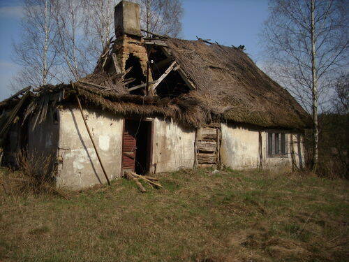 Idziemy dalej. Ignorując dość liczne tu pomniejsze rozwidlenia dróg, trzymamy się cały czas oznaczeń szlaku żółtego i szerokiej drogi leśnej. Prowadzi ona w kierunku wsi Drzewce. Po chwili dochodzimy do jednego z gospodarstw tejże bardzo mocno rozrzuconej po puszczy wsi. Jedno z oznaczeń znajduje się bezpośrednio na prawdopodobnie już zabytkowej drewnianej stodole o węgłowej konstrukcji.