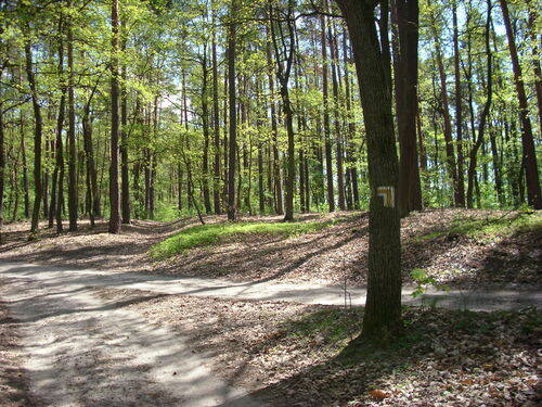 Ruszamy w trasę tryskając energią i w wyjątkowo dobrych humorach. Początkowy etap przebiega asfaltową drogą Międzychód – Sieraków i do najciekawszych nie należy. Gdyby nie budynek byłego dworca PKP Zatom Stary w zasadzie nie było by czego oglądać. Na szczęście żółty szlak bardzo szybko „ściąga” nas z asfaltu i prowadzi leśną drogą w głąb lasu. Droga, jak na drogę leśną jest wyjątkowo szeroka i pozwala na dobre tempo marszu. Nie forsujemy się jednak, idziemy spokojnie równym krokiem. Słoneczko przygrzewa co raz mocniej, wkrótce wierzchnie okrycia robią się zupełnie zbędne. Początek maja a pogoda wyśmienita, jak w środku lata (chyba na przekór przewidywaniom „szamanów” od pogody).