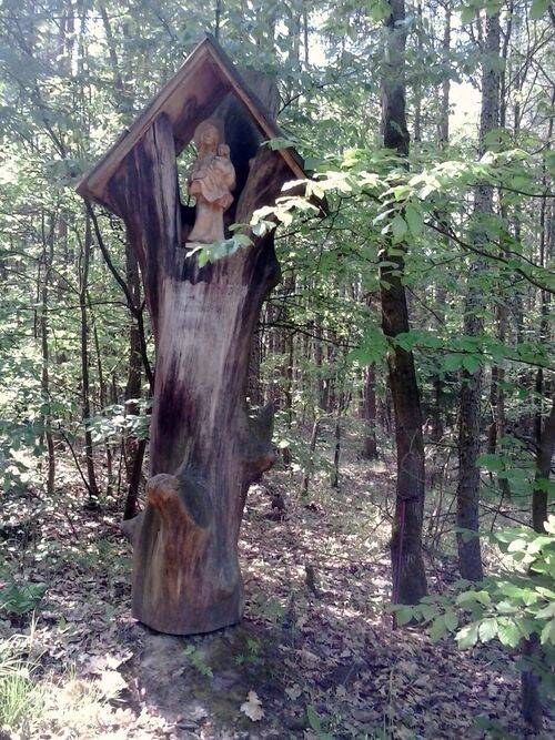 Kaplin jest bardzo malutką wioską (do końca 2015 r. Kaplin był częścią wsi Mokrzec), przez którą przeszliśmy w kilka minut. Michał przystanął tylko na chwilę przy kolejnym przydrożnym krzyżu (w wiadomym celu). I tak doszliśmy do lasu za Kaplinem, gdzie oficjalnie zakończyliśmy wędrówkę szlakiem czarnym. Teraz do pokonania została nam tylko ścieżka dydaktyczna „Bobrowy zakątek”.