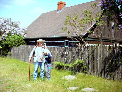 Ładną drogą wśród drzew, które tworzyły nad naszymi głowami liściasty sufit dochodzimy do wsi Radgoszcz. Tam przystanęliśmy na chwilę na wzgórzu, z którego rozpościerał się piękny widok na jezioro i lasy Puszczy Noteckiej. Uwieczniliśmy się także na zdjęciu przy zabytkowej, całkowicie drewnianej chatce, a Michał nie omieszkał pomodlić się chwilę przy przydrożnym krzyżu. Michał modli się przy każdym napotkanym krzyżu lub figurze. I trochę czasu mu to zajmuje. Ale skoro ma taką potrzebę, to niech się chłopak modli. Zawsze to bezpieczniej mieć „Górę” po swojej stronie.