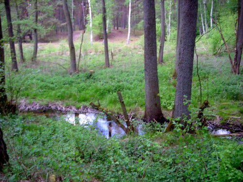 Od tego miejsca wygodna i dość szeroka dotąd droga zmieniła się w niewielką ścieżynkę biegnącą brzegiem jeziora. Chwilę później ścieżka zaginęła w trawie i w mchu na dość podmokłym leśnym terenie. Spotkaliśmy tu także lisa, który przyglądał się nam z pewnej odległości. Przyglądał się nam dość długo stojąc nieruchomo w miejscu. Trochę nas to zaniepokoiło, bowiem zdrowe dzikie zwierzęta powinny raczej czym prędzej czmychać na widok człowieka. W końcu jednak poszedł w swoją stronę. Być może znudził się naszym widokiem, a może po prostu doszedł do wniosku, że na jego dzisiejsze danie jesteśmy zwyczajnie za duzi.