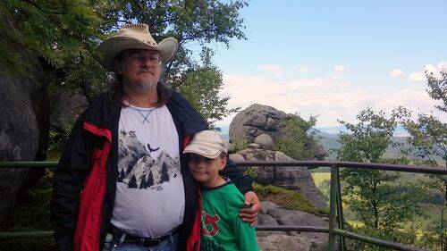 Wchodzę z Michałem na punkt widokowy, Ania (która za wysokościami nie przepada) zostaje na tarasie przy schronisku. Przy ładnej pogodzie ze Szczelinca widać Śnieżkę. Mamy to szczęście, że pogoda wyśmienita. Rzeczywiście, gdzieś tam w oddali widać zarys najwyższego po polskiej stronie szczytu w Sudetach Wschodnich.
