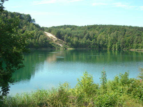 Szlakiem niebieskim dochodzimy do Jeziora Turkusowego i kolejnego punktu widokowego na Górze Piaskowej a następnie ścieżką wzdłuż barierki okalającej jezioro do budynku szkoły w Wapnicy.