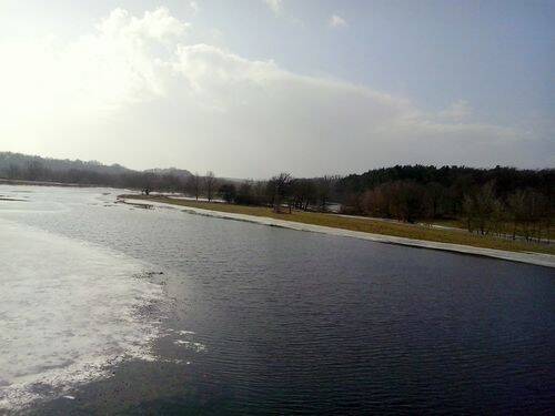 Postanawiamy pójść żółtym szlakiem do karczmy Kuźniak młyn. Na pieczone ziemniaczki, które akurat tam niezmiennie wyśmienicie nam smakują. Wyruszamy. Przechodzimy przez nadal remontowany (a właściwie budowany obok od nowa) most nad Wartą i jesteśmy już tuż tuż drugiego mostu nad zalewem rzeki. I tu naocznie przekonujemy się, że to jednak jeszcze zima. Rozlewisko nadal mocno skute lodem.